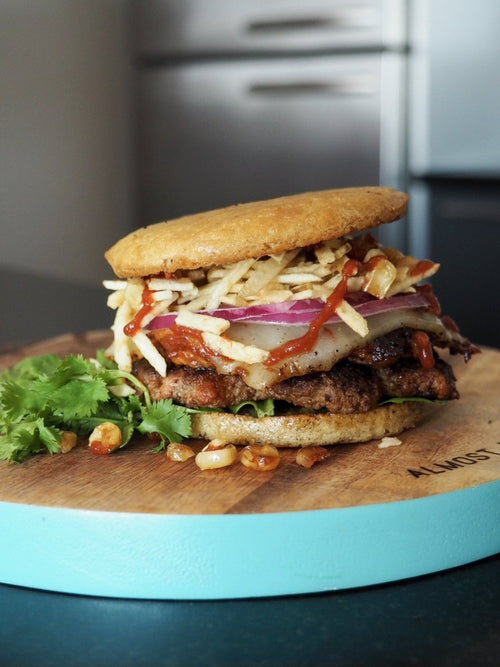 - To build the burger, start by layering spinach and a cheese-less patty, followed by the patty with cheese, red onion, shoestring fries and roasted corn.