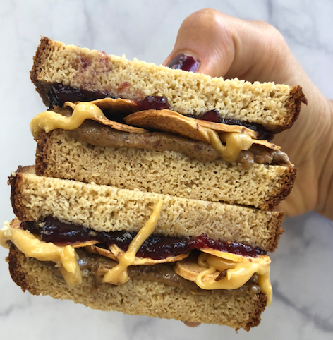 - Cover one slice of Mikey’s Sliced Bread with crunchy Nuttzo Peanut Pro and grape jelly