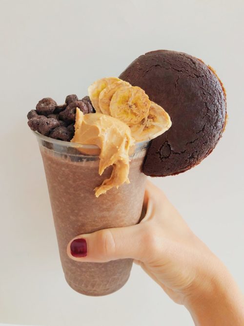 - Top with Chocolate Power O’s, peanut butter, plantains, and a warm Mikey’s Muffin Top!