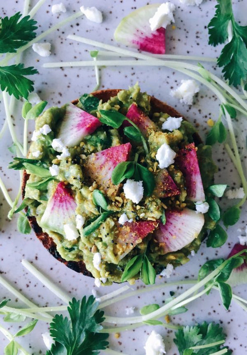 - Top with watermelon radish, sheep feta (or a cheese substitute), pea greens, and turmeric seed spice