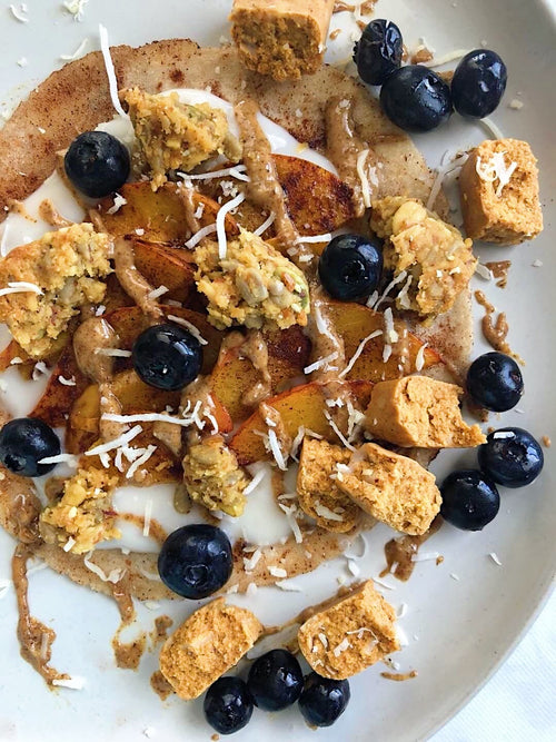 - Top with a cinnamon cooked peach, @wholeme almond coconut clusters, and a cut up vanilla Atlas bar , blueberries, and coconut shavings