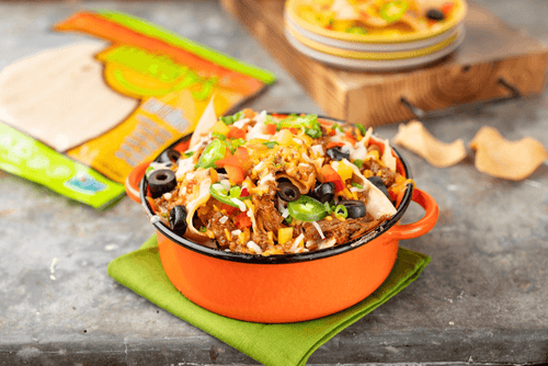 - Layer chips, cheese, and chicken and bake until cheese is melted